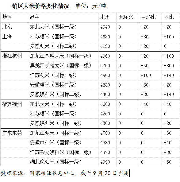 本周,销区市场大米走货平稳,价格以稳为主。目前“双节”备货已基本完成,但用米需求仍较旺盛,不同品种间价格走势分化,全国多地天气转凉、易于储存,下游经销商备货需求走稳。短期内缺乏拉动大米行情走强的因素,预计月内大米价格仍将以稳为主,“稻强米弱”格局依旧。